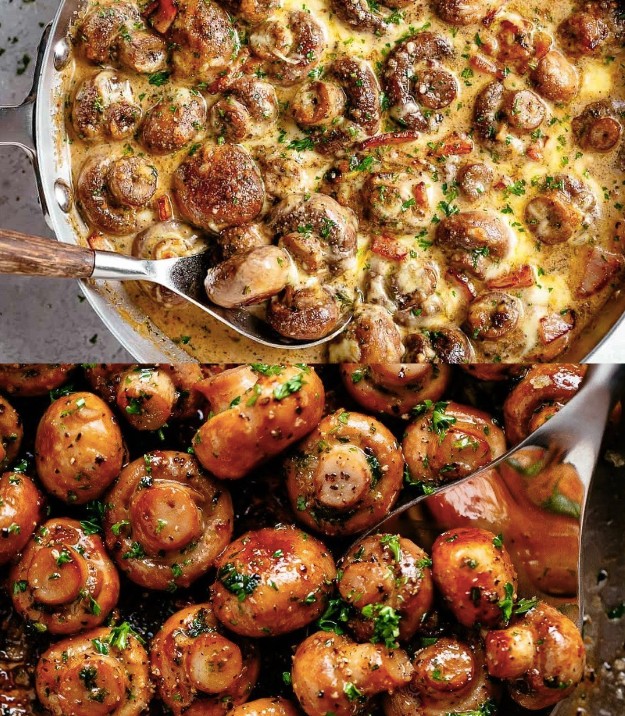 2 . Jetzt die Butter in einer Pfanne erhitzen und die Champignons und Zwiebeln darin anbraten.Mit Mehl darüber stäuben.