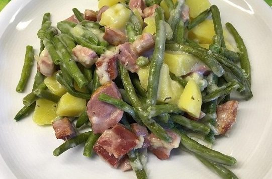 Die Kartoffeln gerade eben gar kochen, pellen und in grobe Stรผcke schneiden. Grรผne Bohnen putzen und in kochendem Salzwasser fast gar kochen. Abgieรen und das Wasser auffangen. Das Kasseler in grobe Wรผrfel schneiden.In einer Pfanne bei mittlerer Hitze und wenig Fett das Fleisch von allen Seiten anbraten. Das Mehl darรผber streuen und mitbraten. Mit der Milch ablรถschen. Gut verrรผhren und aufkochen lassen. Die Sahne hinzufรผgen und gut verrรผhren. So viel Bohnenwasser zufรผgen, das eine schรถne, sรคmige Soรe entsteht. Krรคftig mit Salz, Pfeffer und Bohnenkraut wรผrzen.