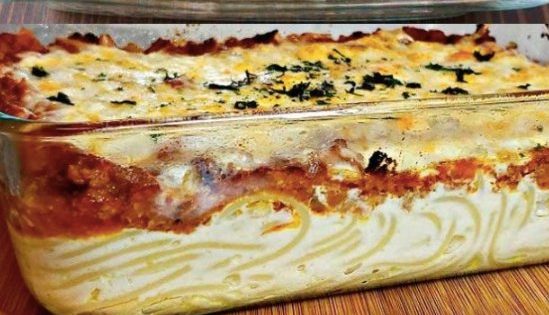 Die Hรคlfte der Spaghetti in die Auflaufform geben und gleichmรครig verteilen. Ricotta-Creme zur Hรคlfte auf den Spaghetti verstreichen und mit der halben Menge Hackfleischsoรe bedecken. Die Schichten wiederholen, bis alle Zutaten verbraucht sind. Gleichmรครig mit Mozzarella bestreuen.