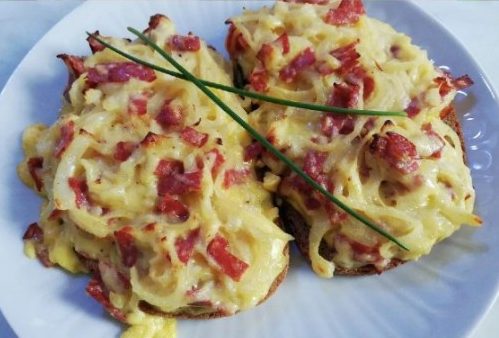 Den Backofen auf 200 Grad vorheizen, die Masse auf das Brot streichen und ca. 10 Minuten backen.