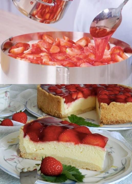 Für das Topping Erdbeeren in dünne Scheiben schneiden und von außen in Kreisen auf die Creme legen. Den roten Tortenguss nach Packungsanleitung vorbereiten und direkt über die Erdbeeren geben. Den Guss festwerden lassen, dann aus der Form lösen und bis zum Servieren kaltstellen. Der Kuchen ergibt ca. 12 Stücke.