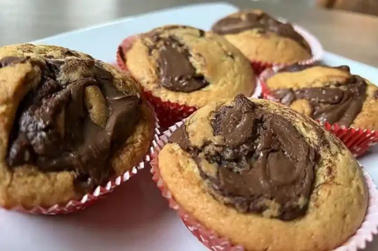 Als nachstes den fertigen Teig mithilfe eines Spritzbeutels in Muffinförmchen füllen. Dann je einen Teelöffel Nutella auf den Teig geben und mit einem Zahnstocher zu einem marmorierten Muster formen.