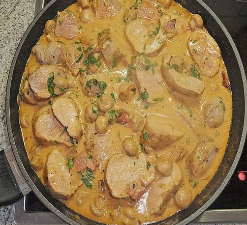 1. Als erstes das Fleisch in dünne Scheiben schneiden, bischen anbraten und in einem Bräter schichten (abwechselnd Fleisch, Käse, Pilze, Fleisch etc). Danach die Champignons auch mitbraten.