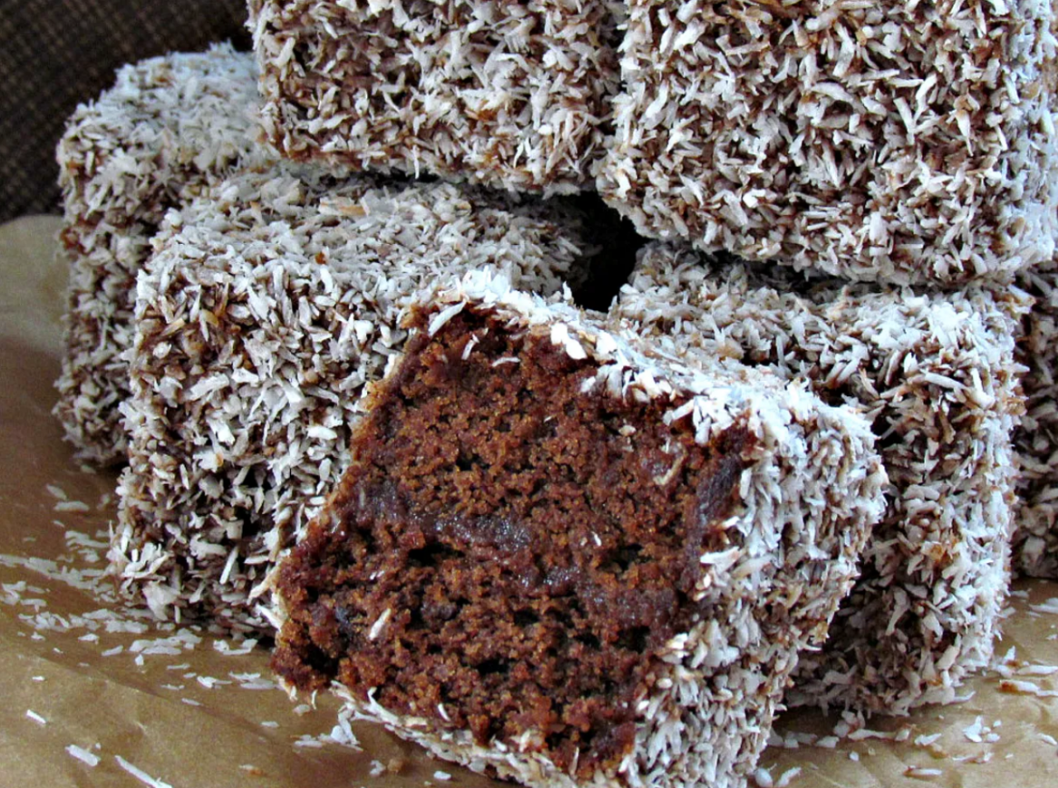 Das Biskuit in jeweils drei Fingerbreite Vierecke schneiden. Die Kokosraspeln in einen tiefen Teller geben.
