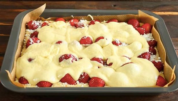 Danach 1 Tasse Mehl mit einem Pรคckchen Backpulver und zum Schluss den Eischnee vorsichtig unterheben.Mit Obst belegen.