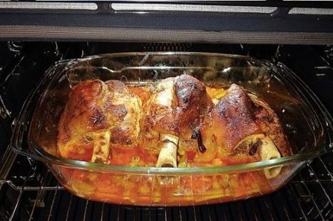Kurz bevor die Zeit um ist, den Ofen vorheizen auf 180 bis 200 ยฐC. Die Haxen aus dem Wasser nehmen, abtropfen lassen und in einer guten Stunde im Ofen knusprig braten.
