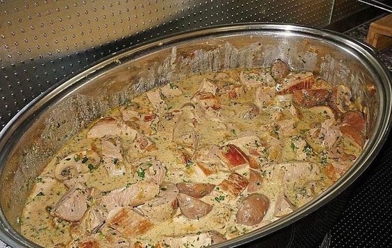 Die Champignons putzen und in Scheiben schneiden. Wenn es sehr kleine Champignons aus dem Glas sind, kรถnnen sie ganz bleiben. Champignons mitbraten. Dann mit Brรผhe ablรถschen und Sahne und Crรจme fraรฎche oder Schmand und den ausgetretenen Fleischsaft zugeben. Die Soรe mit Salz, Pfeffer, Tomatenmark und Senf krรคftig abschmecken. Sollte sie zu flรผssig sein, etwas Speisestรคrke in wenig kaltem Wasser anrรผhren und unter Rรผhren zur kochenden Soรe geben, bis zur gewรผnschten Konsistenz. Soรe abkรผhlen lassen.