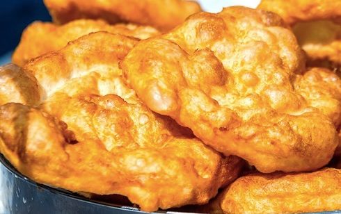 3. Den Teig in 6 Stรผcke teilen, zu Kugeln formen und mit der Hand zu dรผnnen Fladen auseinander ziehen, wobei der Rand etwas dicker als die Mitte sein sollte. In einer beschichteten Pfanne รl erhitzen und die Lรกngos in ca.2-3 Minuten pro Seite hellbraun ausbacken.