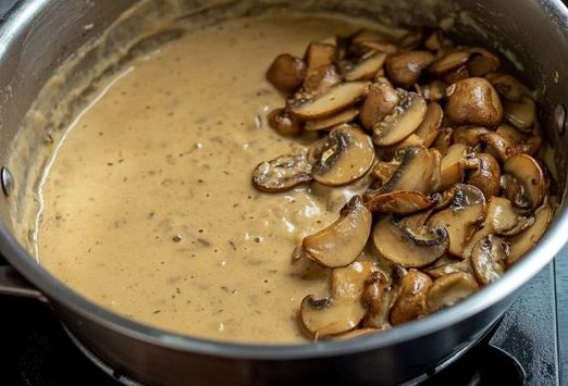 Sahne und die angebratenen Pilze hinzufügen. Bei niedriger Hitze 5–10 Minuten köcheln lassen, bis die Sauce cremig ist. Mit Salz, Pfeffer und Zitronensaft abschmecken.